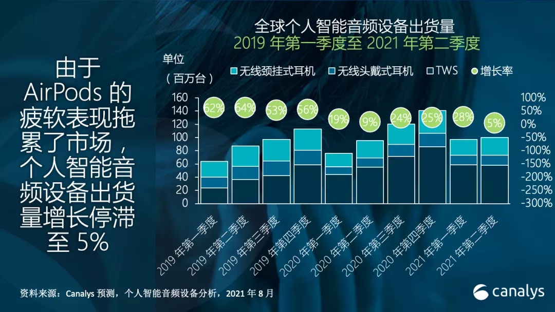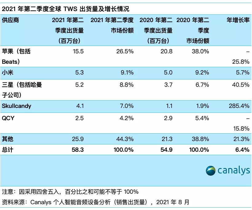 Canalys:全球 TWS 市场 2021 Q2 增长率为 6.4%,为近三年来最低