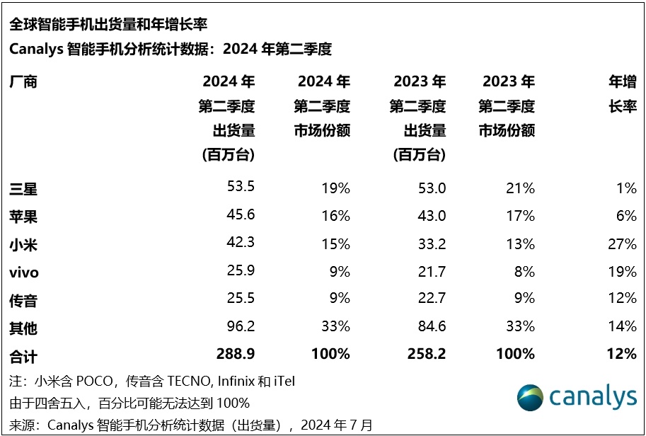 依据Canalys发布的陈述,2024年第二季度,全球智能手机商场再一次完成了双位数的增加,出货量达2.889亿台。遭到产品立异及营商条件改进的推进,全球智能手机商场现已接连三个季度正增加。